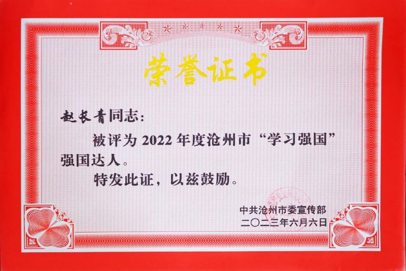 赵长青被评为2022年度沧州市“学习强国”强国达人荣誉称号