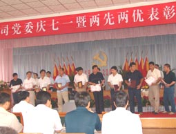 大会在雄壮的国歌声中开始。公司党委委员、总经理姬洪利同志宣读了公司党委《关于表彰2007年度暨2008年“争先创优”活动先进集体和优秀个人的决定》。在工作人员宣读完受表彰的先进集体和优秀个人名单后,大会对在2007年度为企业发展和进步做出突出贡献的7个先进基层党组织和2个党风廉政建设先进党总支、支部及2008年“争先创优”竞赛活动涌现出的5个优胜党总支、支部和10名模范党员颁发了奖牌和奖杯。王德华、文兴峰、姚金岗三名同志分别代表先进基层党组织、优秀共产党员、和“争先创优”模范党员做了表态发言。
