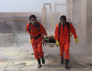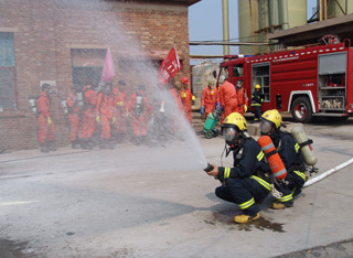 在模拟火灾现场,救援车辆满载救援队员及抢救器材、物资在第一时间进入现场,救援人员使用干粉灭火器,对准火源,迅速将火扑灭。与此同时,在模拟液氯钢瓶泄漏救援演练现场,液氯钢瓶发生泄漏,救援人员一面组织现场人员用湿毛巾捂住口,向上风口方向紧急疏散;一面佩戴专业空气呼吸器,身着防化服,用液氯捕消器对泄漏源实施氯气捕消和封堵,并将封堵后的钢瓶由叉车送到液碱池进行中和处理。在救援过程中,现场有一人氯气中毒,现场总指挥立即派出4名救援队员用担架将伤员移至安全地带,并同时向医疗急救中心和消防大队请求救援。随后,救护车、消防车先后赶到,医护人员迅速对受伤人员实施抢救,消防人员则马上启动消防设施,进行水雾空中喷洒,将空气中的氯气吸附,控制事故范围。事故处理完毕后,经现场毒气检测,空气中氯气含量降至安全水平。至此,2010年中盐长芦沧州盐化集团有限公司危险化学品及消防应急救援演练顺利结束。