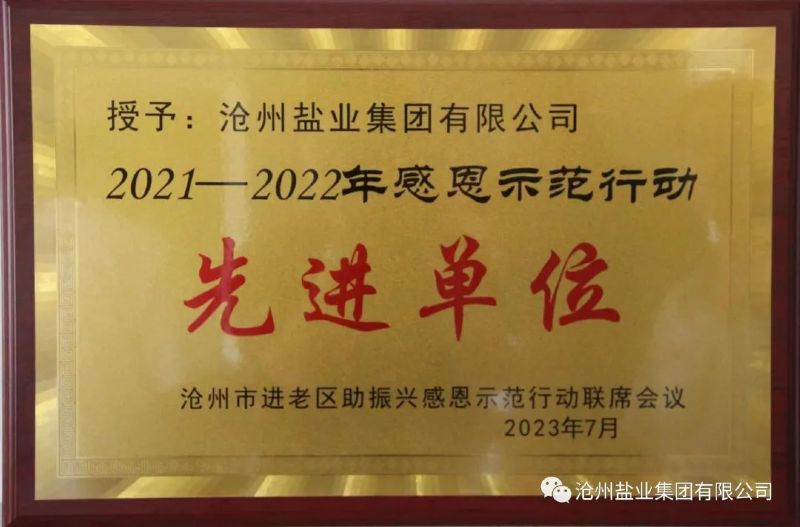 2023年7月,集团公司被沧州市进老区助振兴感恩示范行动联席会议授予“2021―2022年感恩示范行动先进单位”荣誉称号。