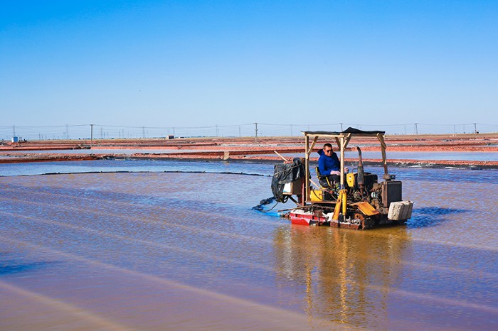 青锋公司盐区四副滩同时开耙,扒盐、活茬全部采用机械作业。目前,卤水充足,每天可完成2个结晶池收盐。