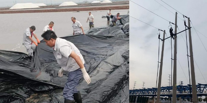 受强降雨及大风影响,长芦黄骅盐业有限公司、青锋盐业有限公司塑膜大范围被毁,在建项目及建筑公司各施工项目房屋、围挡、大门、牌子等均有损坏,大风还造成公司电力线路受损,公司大面积停电,其他单位库房、车间房顶、门窗及生产生活设施也有不同程度损坏。