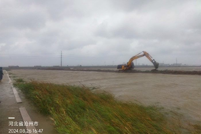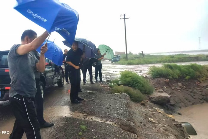 8月26日中午12点至下午5点,疾风骤雨袭击厂区,最大风力持续达11级,几个小时内降雨量达150毫米以上,滩田内波浪翻滚,猛烈冲击着堤埝。渤海新区黄骅市气象灾害防御指挥部将重大气象灾害由二级应急响应提升为一级。集团公司党委副书记、总经理张立庄率队亲临生产一线督导防汛工作。