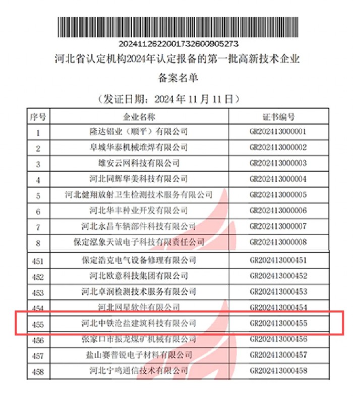 近日,河北中铁沧盐建筑科技有限公司顺利通过了国家高新技术企业复审,并于2024年11月27日取得了新版“国家高新技术企业”证书。