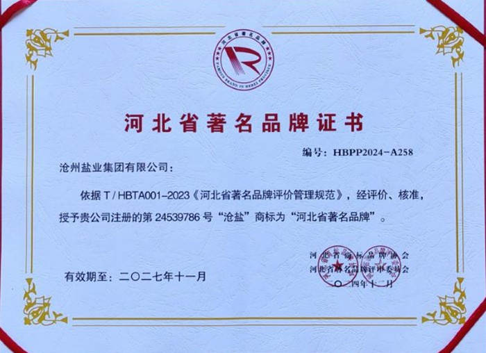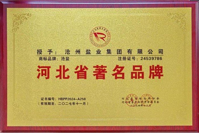 近日,河北省商标品牌协会组织开展的2024年度“河北省著名、知名、优秀品牌”评选结果正式揭晓,经过严格的评审和筛选,沧州盐业集团有限公司注册号为24539786的“沧盐”牌商标被评定为“河北省著名品牌”,沧州盐业集团有限公司被授予“河北省商标品牌协会副会长单位”。