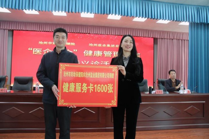 在参会人员的共同见证下,张立庄、徐闻铂分别代表沧盐集团、沧州市妇幼保健院签订了“医企融合”健康管理合作意向书。张立庄、狄彬、徐闻铂、崔国光共同为“医企融合”健康管理合作单位揭牌。崔国芳代表沧盐集团现场接受了沧州市妇幼保健院捐赠的1600余张健康服务卡。