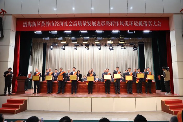 2月28日,在渤海新区黄骅市经济社会高质量发展表彰 暨转作风优环境抓落实大会中,河北中铁沧盐木业发展有限公司荣获全市2024年度重大项目建设先进单位荣誉称号,公司总经理海滨出席本次会议并上台领奖。