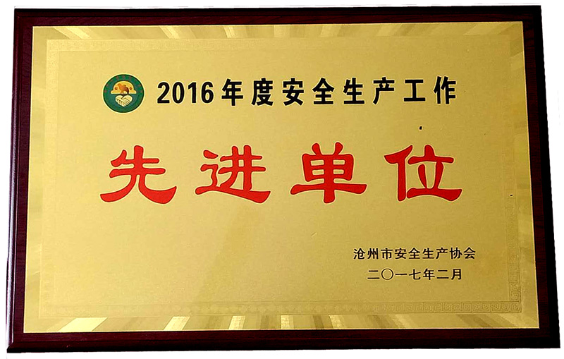 日前,公司被沧州市安全生产协会评为“2016年度安全生产工作先进单位”。